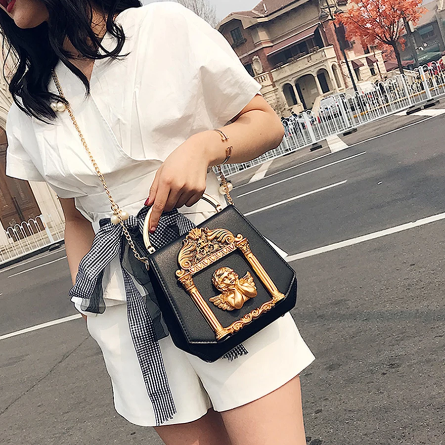 صور ل تصميم حقائب جلدية الرجعية الباروك الملاك تنقش المرأة حقيبة يد محفظة اللؤلؤ سلاسل رسول حقيبة كتف السيدات بو Crossbody حقيبة